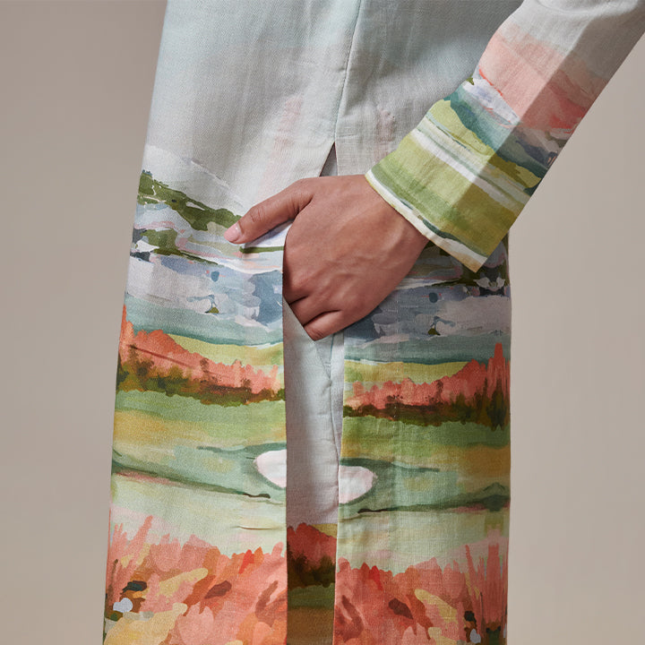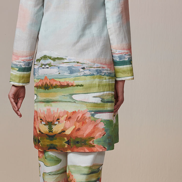Radiate warmth and charm with "Meadow Medley" Kurta and Pant set, capturing the golden hour's enchanting glow. The outfit is a testament to both style and comfort.Natural variations in colors are part of the textile; in fact, these little details make each product unique.