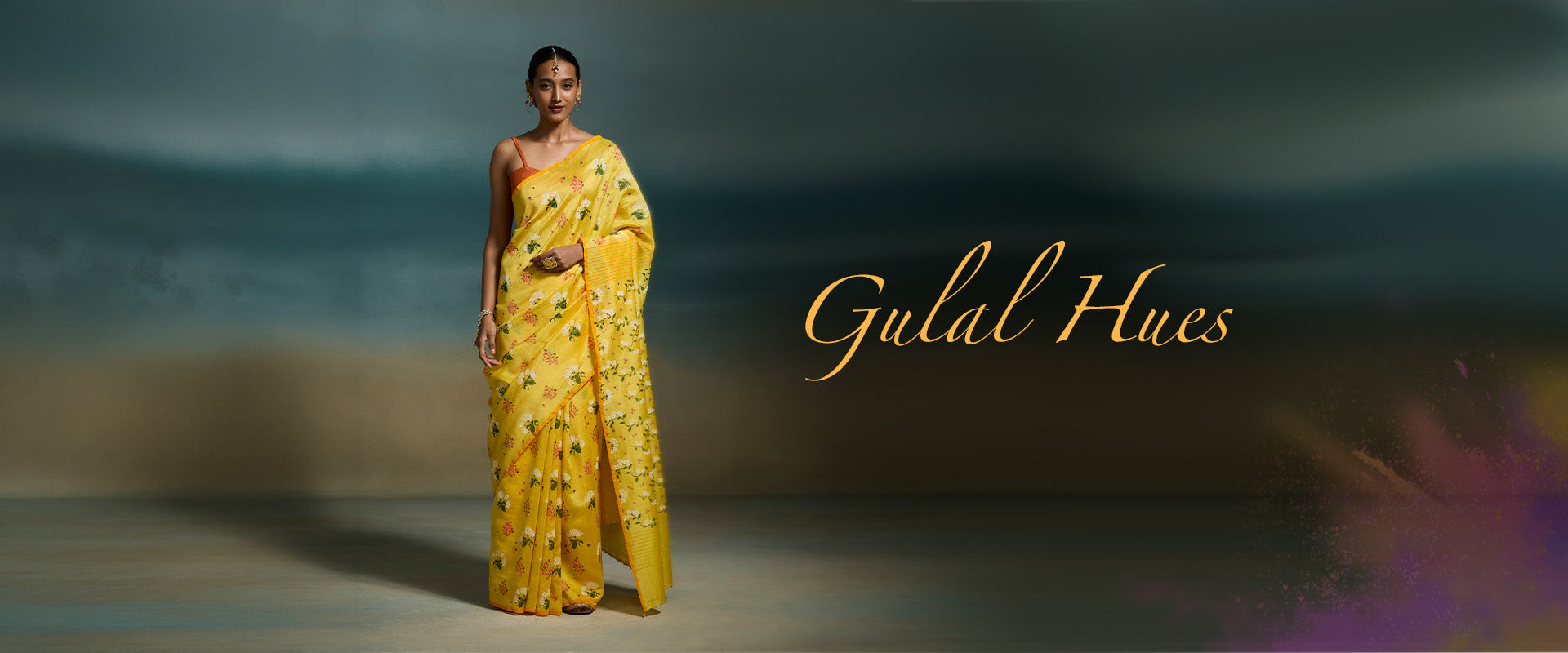 Yellow-pink ombre linen saree with silver-copper zari details