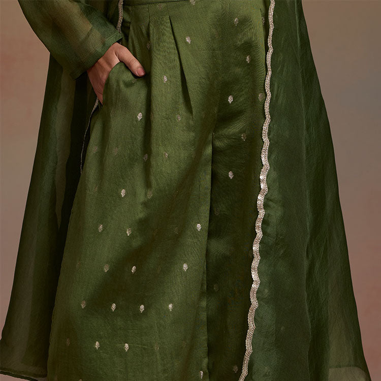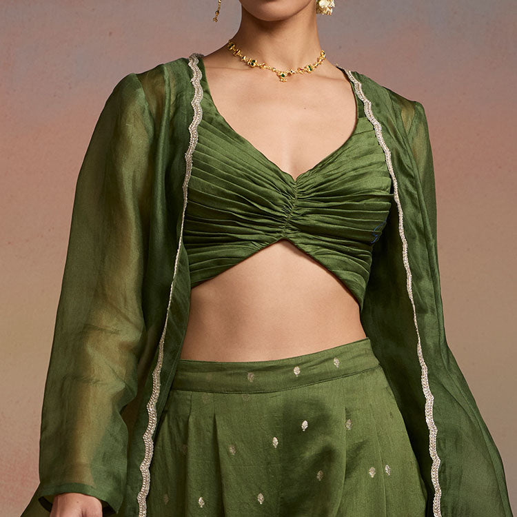 An elegant three-piece set in olive green featuring a blouse, matching pants, and a delicate organza shrug adorned with lace. Soft yet structured, this set moves effortlessly with you, offering comfort throughout festive evenings, wedding rituals, or celebratory dinners.