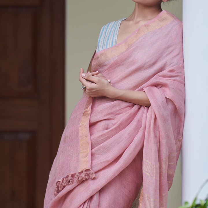 This dust rose handwoven linen saree with subtle gold zari details and delicate jamdani motifs is perfect for when you have a lot to say, and yet, aim to keep people wanting more. A minimalist's dream.