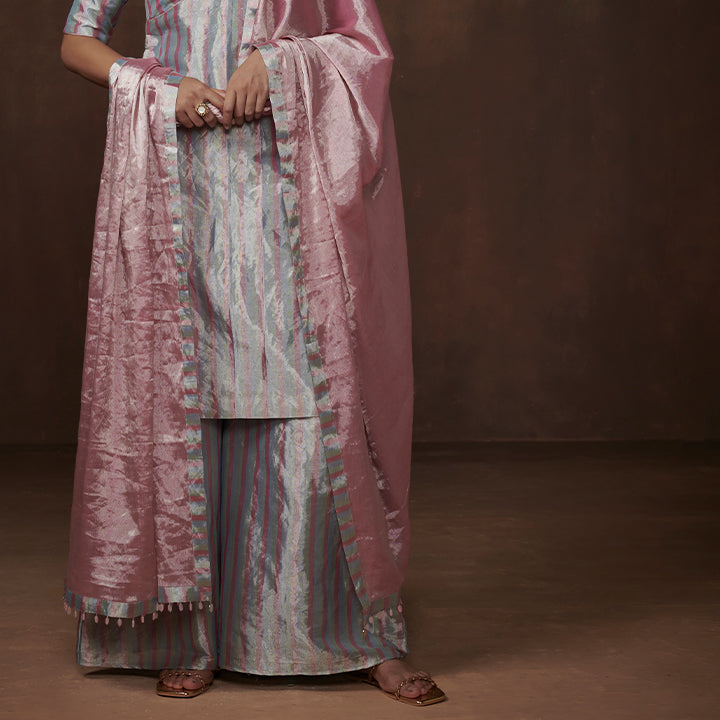Adorned with a delicate blend of pastel metallic hues, this elegant 'Aaloka Kurta and Pant' ensemble is crafted in handwoven tissue fabric, to create a sophisticated look suitable for any occasion.