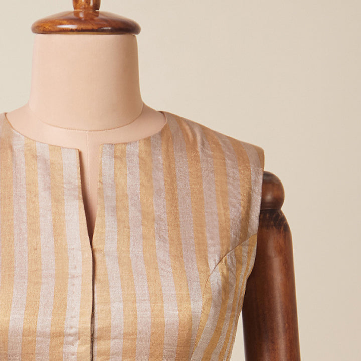 This silver & golden zari blouse makes for a thoughtful wardrobe addition. With a front open and in-cut shoulders, it is ideal for an effortless experience.