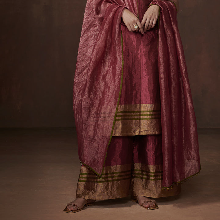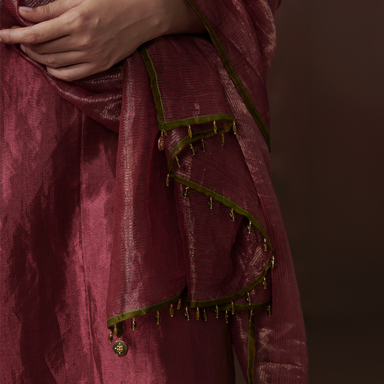 Handwoven silk-cotton dupatta, in pink. With fine zari stripes in gold and glass bead details; this classic dupatta adds a sophisticated touch to any ensemble.