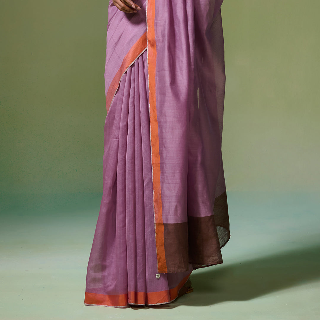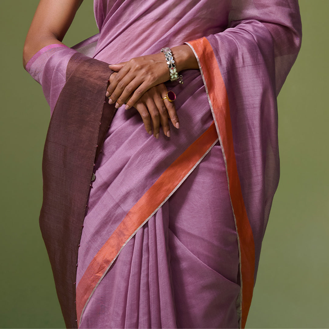 This Chanderi saree, 'Begum', in light purple, exudes royalty, complemented by a striking contrast orange silk border. The pallu is finished with glass beads and Dressfolk coins at the corners of the palla.