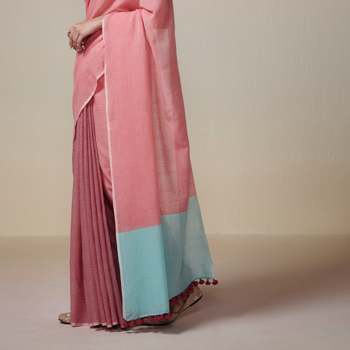 Experience the beauty of dawn with "Carnation" saree, reflecting the soft hues of sunkissed petals. The blend of darker and lighter tones embodies the ever-changing view of landscape.