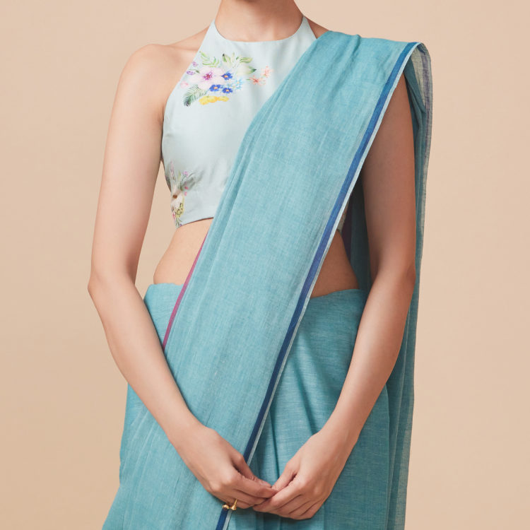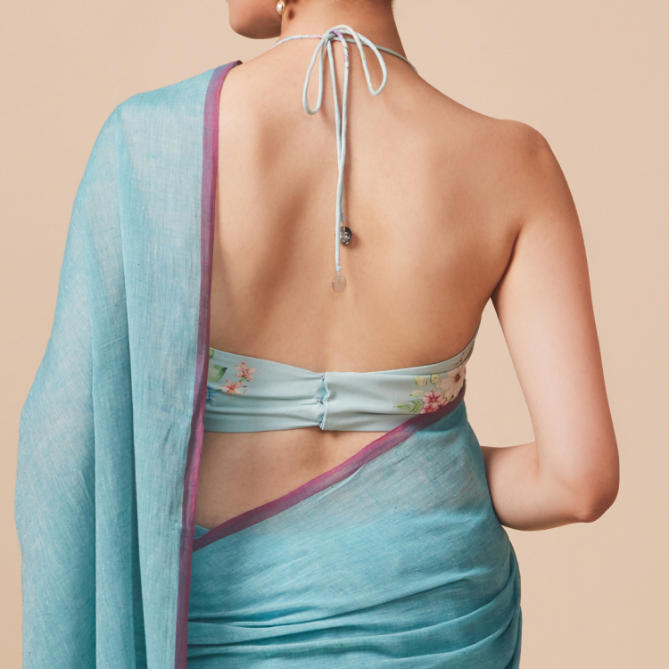 The Rise blouse is a vibrant blend of tradition and style. Featuring a round neck and botanical beauty, this halter-style design stands out in a striking blue hue. It offers both comfort and aesthetic appeal, perfect for any occasion.