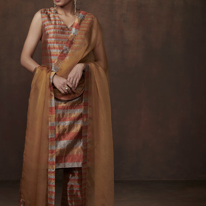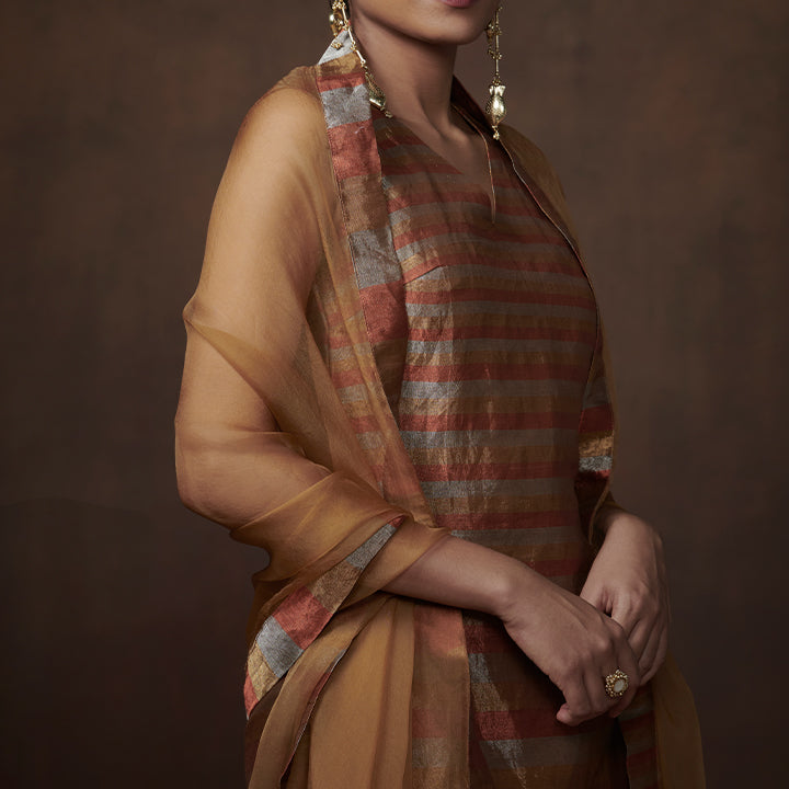 Step into elegance with our 'Deepika Kurta and Pant' ensemble, adorned with a harmonious blend of golden, copper, and silver metallic hues. Crafted in handwoven tissue fabric, it is an ideal choice to create a sophisticated look fit for any occasion.