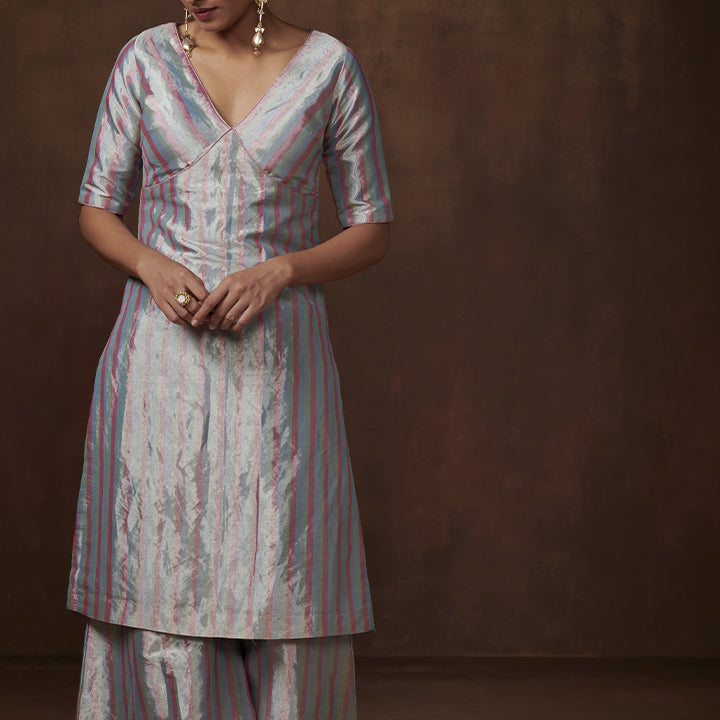 Handwoven Tissue Dupatta, in metallic pastel hues. With striped tissue border, and glass bead details; this dupatta adds a touch of enchantment to your ensemble.