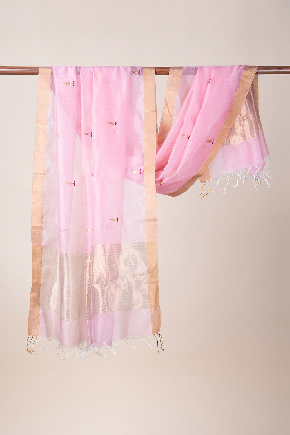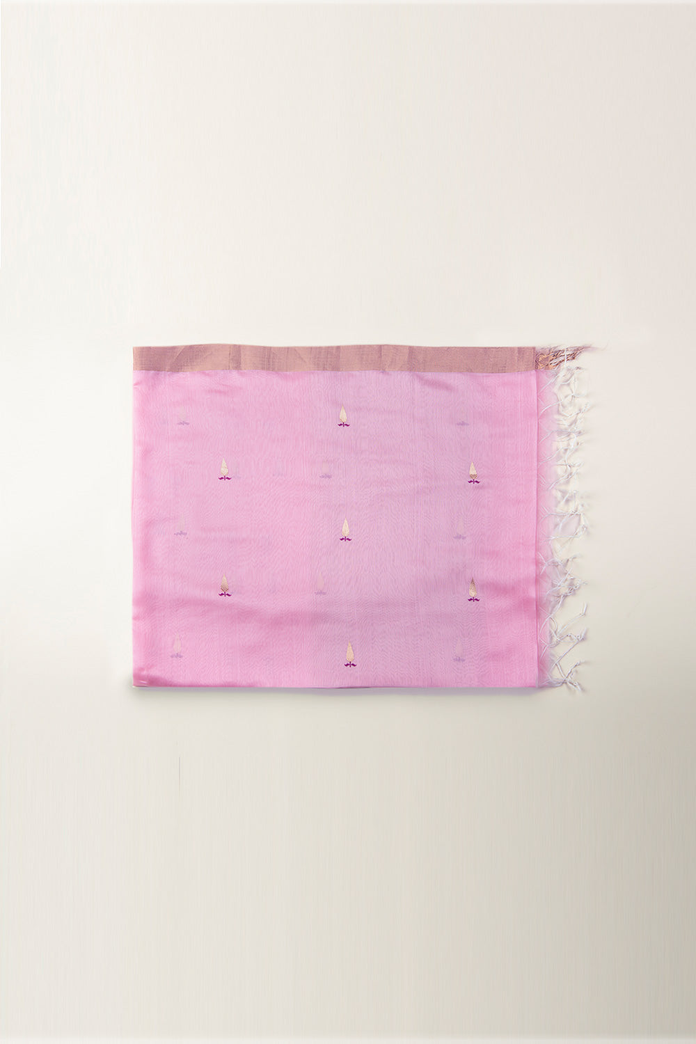 Handwoven in Chanderi, this pink dupatta is adorned with delicate motifs inspired from the northern fields of maize. The traditional kadwaa weaving technique is further accentuated with zari border and hand made tassels.