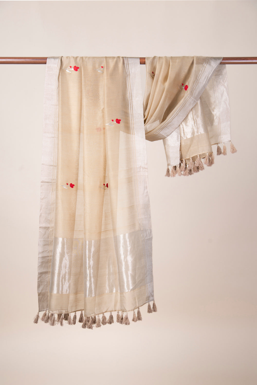 Handwoven in Chanderi, this beige dupatta is adorned with delicate tulip and bud-like motifs in traditional kadwaa technique. It is further accentuated with zari border and hand made tassels.
