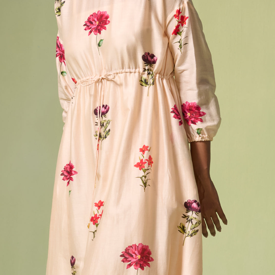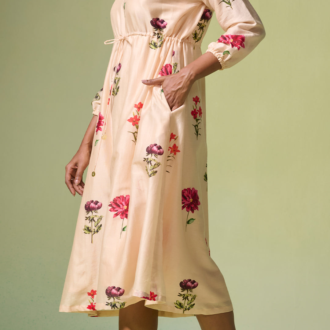 Step into a beautiful flowery paradise with this beige Chanderi dress, 'Heera', with a soft Mulmul slip. The delicate print brings an everlasting grace.