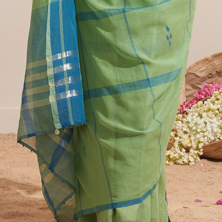 Ilamai is a gentle ode to youth — a serene green base brought to life with blue stripes and subtle geometric motifs. Simple yet striking, its design is elevated by the addition of wooden beads at the pallu, creating quiet drama with every drape.
