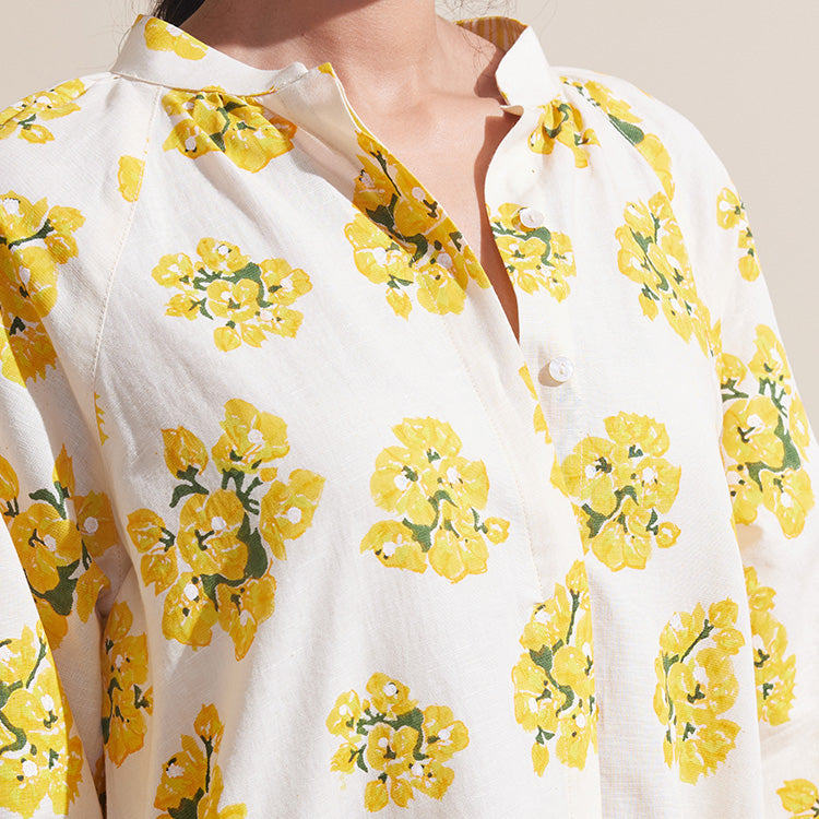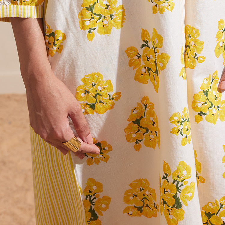 A soft ode to garden mornings, Leela Lime brings together ivory and yellow in a gentle floral print evoking the freshness of lime blossoms and sunlight. The long, gathered silhouette in breathable cotton linen flows with ease, making it an effortless choice for warm days and calm moments.