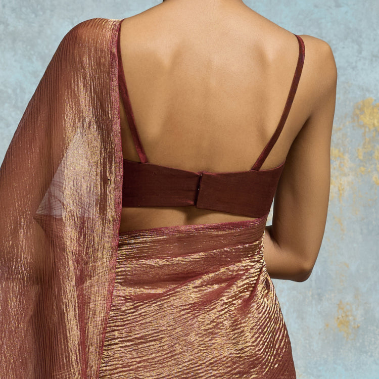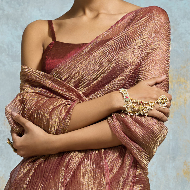 Brighten your wardrobe with this charming Maroon spaghetti blouse in handwoven tissue. The festive maroon serves as a refreshing backdrop for your sarees, creating a sophisticated look.