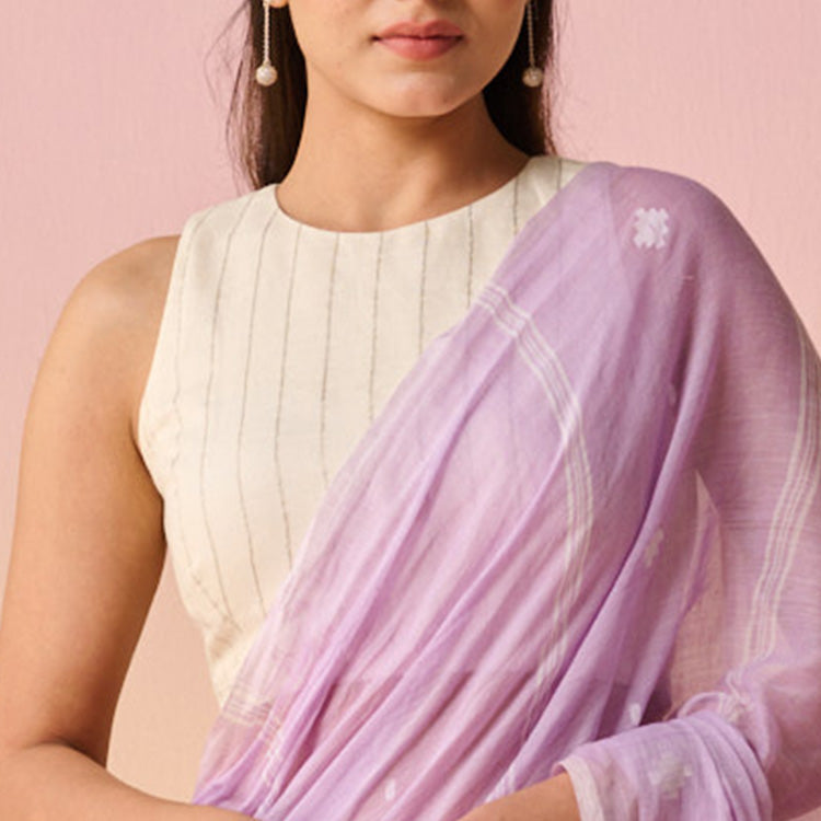 A serene blend of tradition and elegance — this ivory linen blouse features subtle zari stripes and a graceful high round neckline. Understated yet impactful, it’s a versatile piece that lends itself beautifully to both everyday and occasion wear.