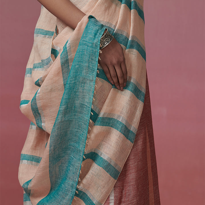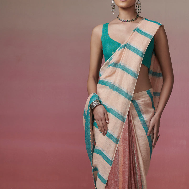 Striped linen saree in peach and rust with zari.