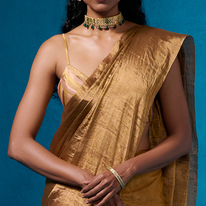 Introducing 'Oriana' - A gold blouse with delicate spaghetti straps, light green and pink stripes on rich tissue fabric, comfortable padding and lining, and a graceful back opening.
