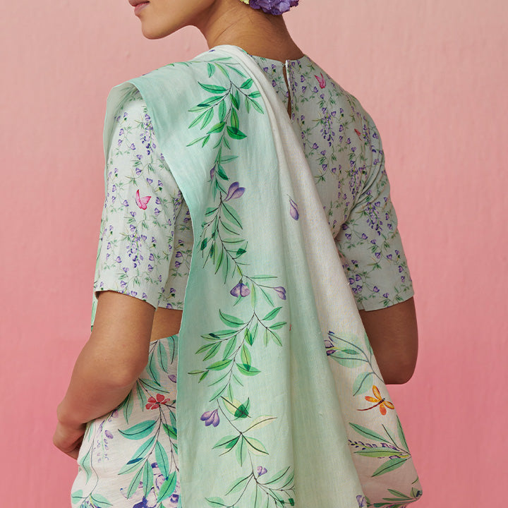An ode to femininity, this powder blue blouse is a head-turner. This Crop top inspired Linen blouse with Intricate floral details and colour takes centre stage. Dress it up or down, it transitions seamlessly.