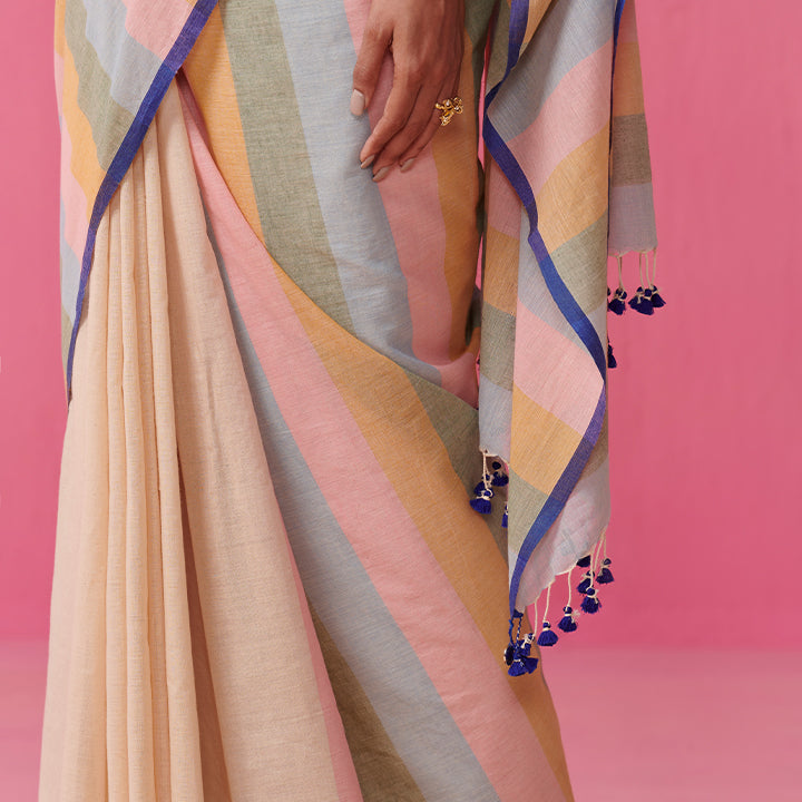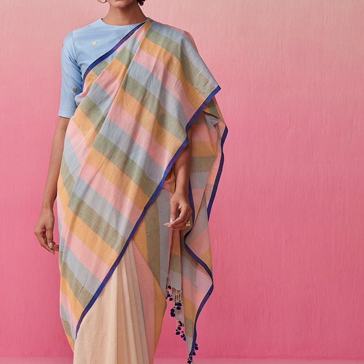 A handwoven cotton saree in a concoction of colours that bring joy and rejuvenation to your summer days. With a refreshing take on timeless cotton sarees, it is crafted to make a fashion statement wherever you go.