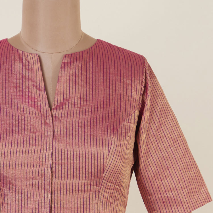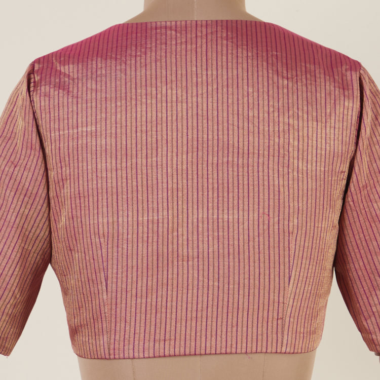 A crop top style-inspired blouse in deep pink, our Rangini is handwoven on the looms of Chanderi. With an interplay of stripes on zari, this blouse has the potential to elevate your ensemble effortlessly.