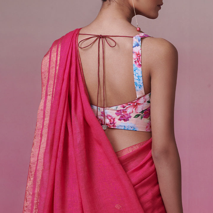 Introducing our delicately designed spaghetti blouse, adorned with intricate floral artwork on a luxurious linen-cotton fabric. In a soft peach hue, it exudes understated elegance.