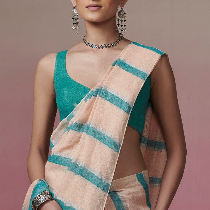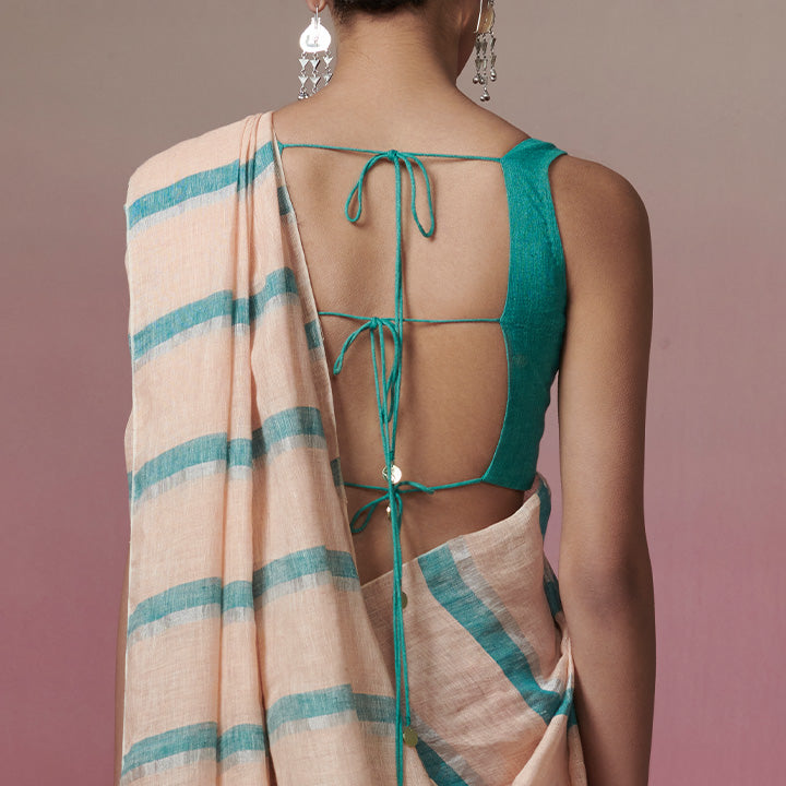 Presenting our sleeveless contemporary blouse, featuring a graceful dori tie-up at the back adorned with a signature Dressfolk coin, in a captivating peacock green hue. This refined piece exudes modern elegance.
