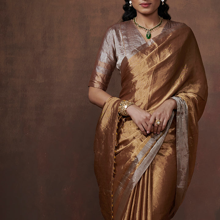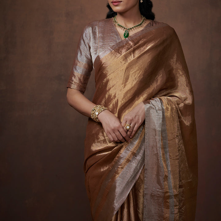 Elevate your fashion statement with the charm of this handwoven tissue saree adorned with metallic golden zari. Elegantly crafted with golden and silver zari, this saree can enhance your style with a touch of subtle sophistication.