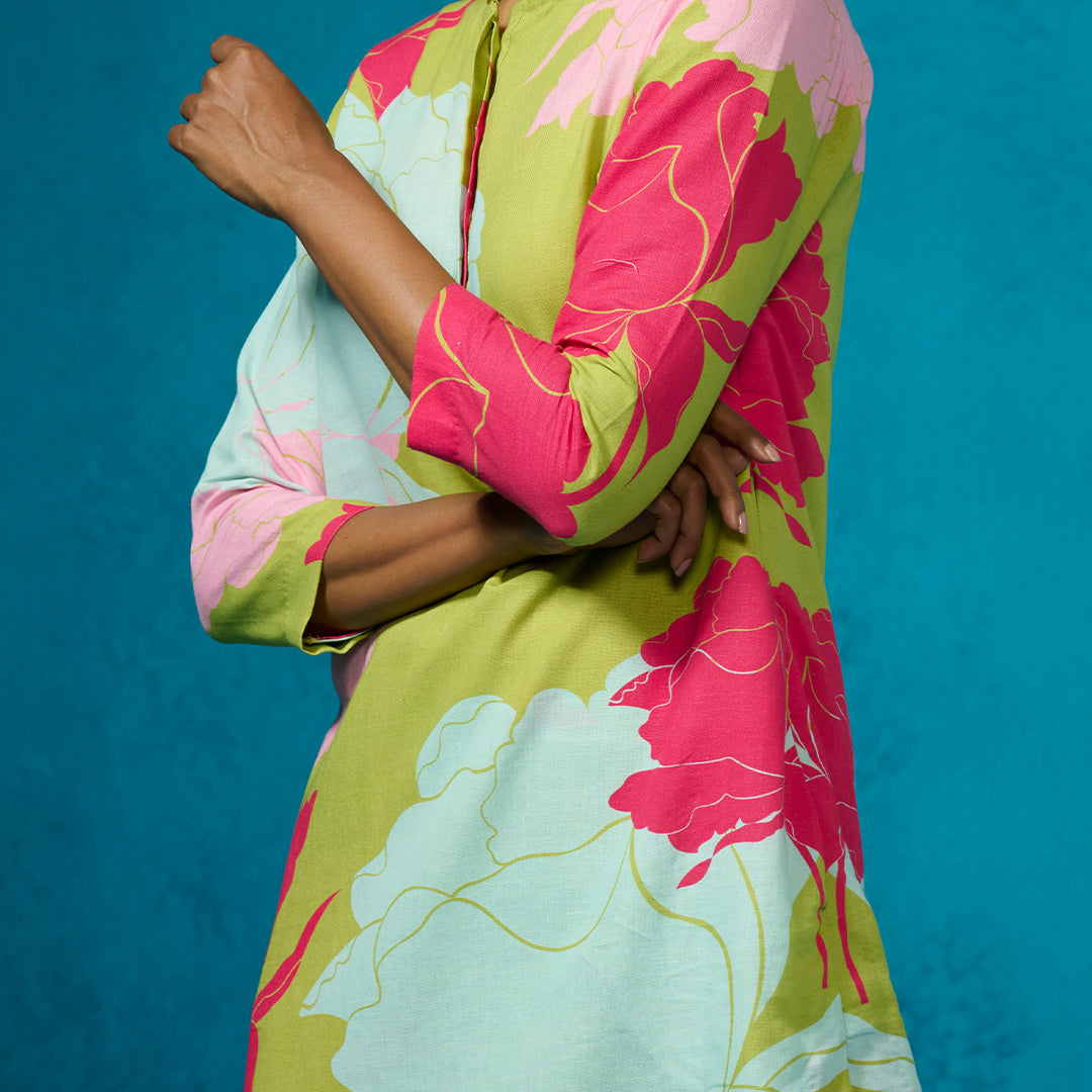 Experience the charm of the 'Stella' tunic and pant set, hand-painted with blooming flowers on linen-cotton fabric, perfect for workwear and devotional events.