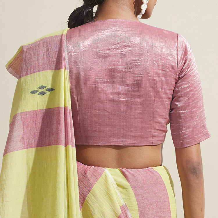 Tailored in old rose striped Chanderi, this blouse brings understated elegance with its V-neck overlap design and soft sheen — ideal for both casual and festive wear.