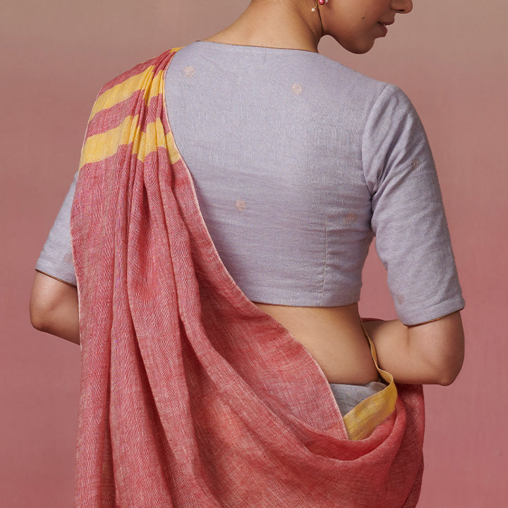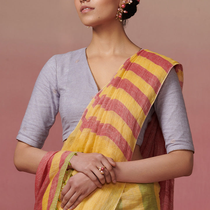 This V-neck blouse, meticulously crafted from handwoven linen, features an exquisite Jamdani motif woven into rich greyish-blue fabric. It adds an unparalleled touch of luxury to your ensemble, elevating your style with its sophisticated elegance.
