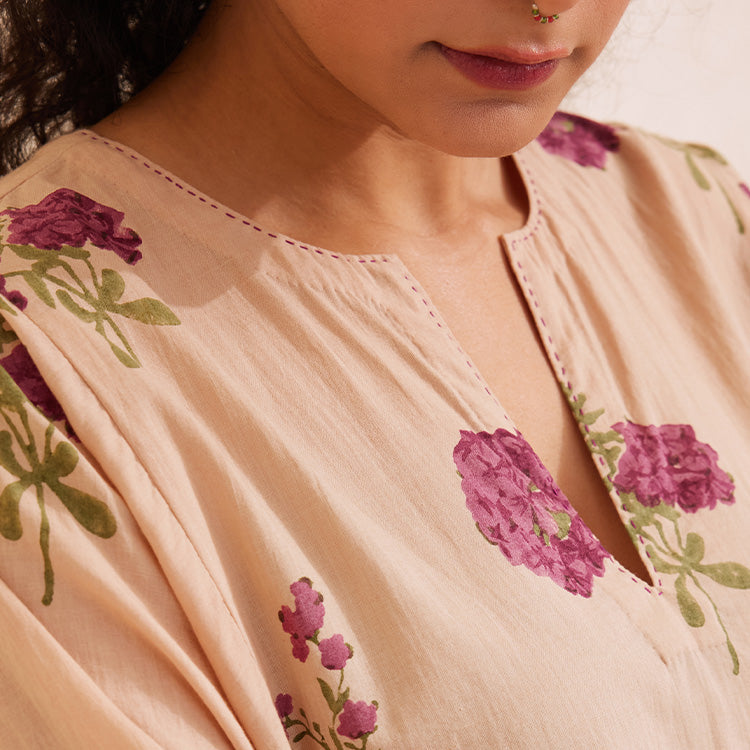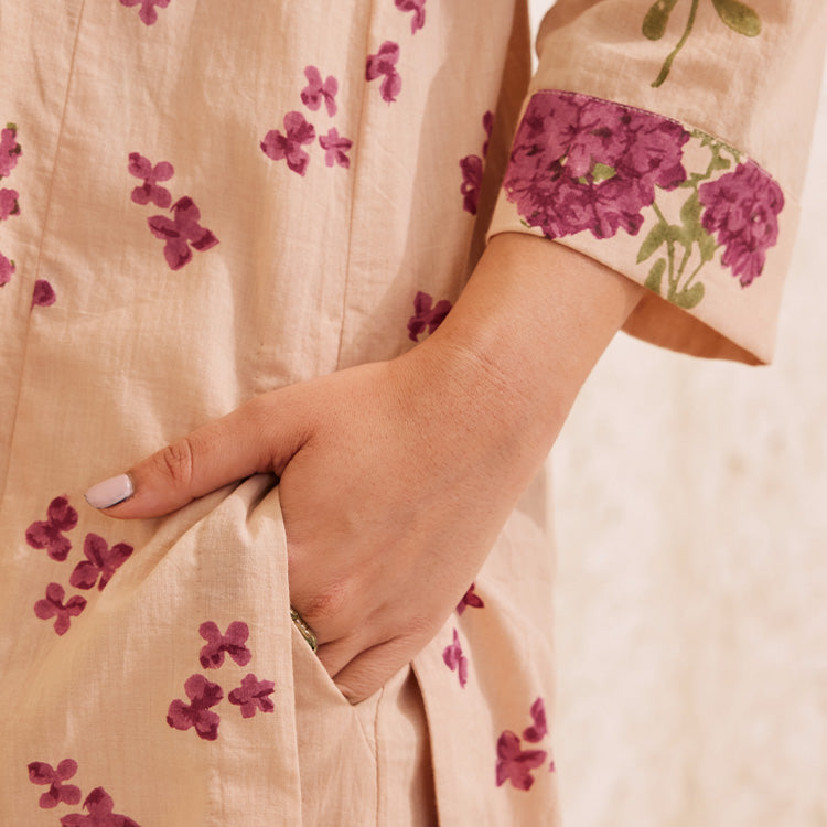 Grace meets simplicity in this ragamala painting-inspired Kurta set. The hand-block-print on onion pink cotton exudes a serene charm. Dive into effortlessly chic silhouettes that are season-friendly.