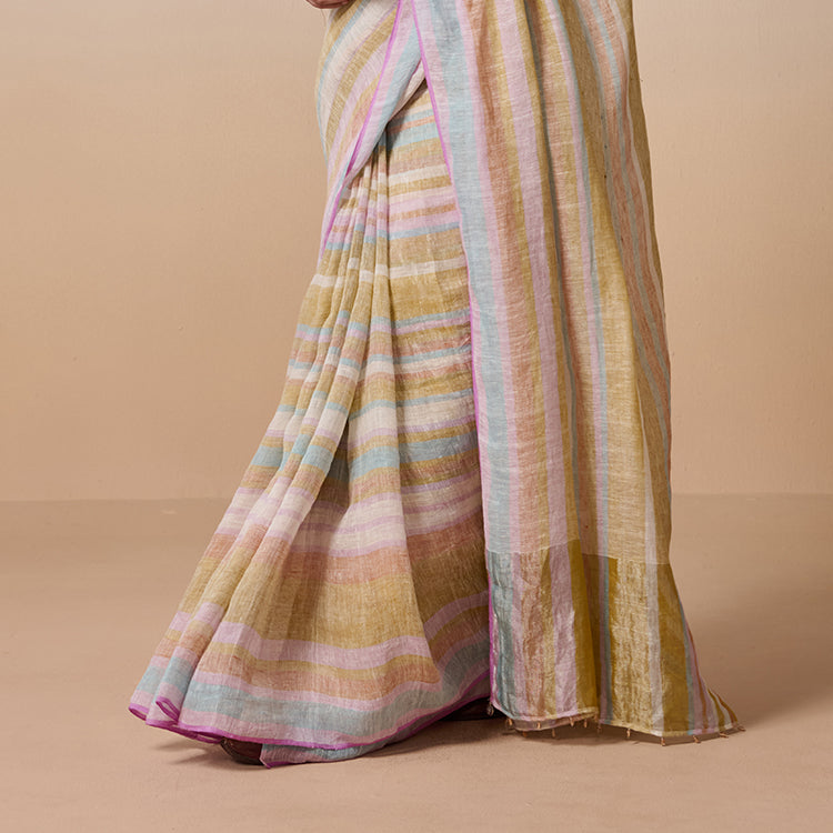 Feel the melody of handwoven artistry in this linen saree– with a striking interplay of colourful stripes varying in thickness, it cues us to imagine a fast-paced musical symphony. The stripes are further accentuated by zari details on the pallu and finished with wooden beads.