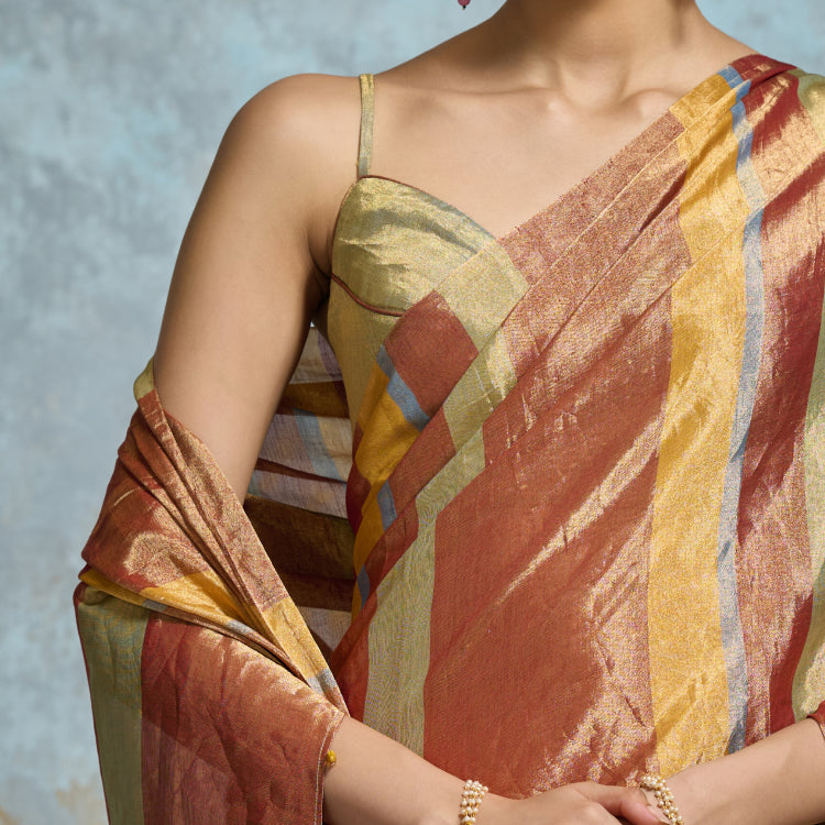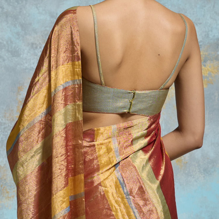 Experience whimsy and some old-world charm, both with this blouse in handwoven Chanderi. Featuring delicate spaghetti straps with copper piping; it's an incredibly delightful addition to a modern wardrobe.