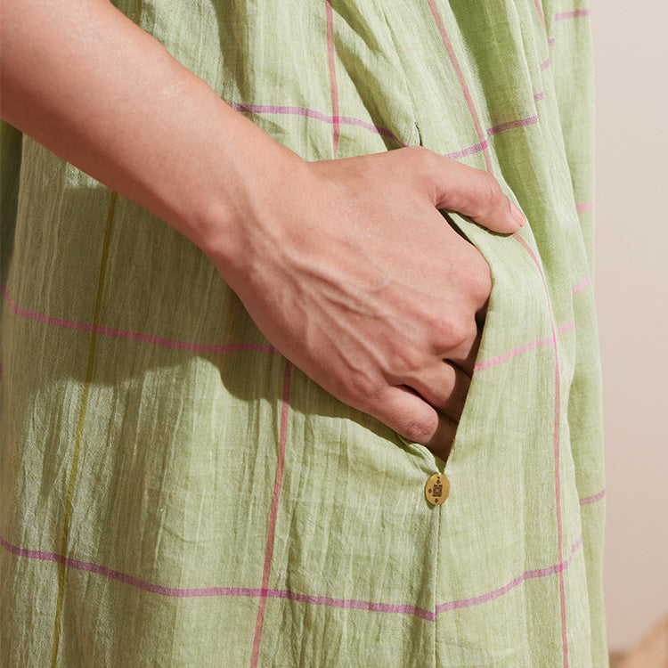 A tribute to breezy verandas and lazy southern summers, Thinnai is a long gathered kaftan in soft Madras checks. The handwoven cotton drapes with gentle volume, offering comfort and understated style in a refreshing lime green hue.