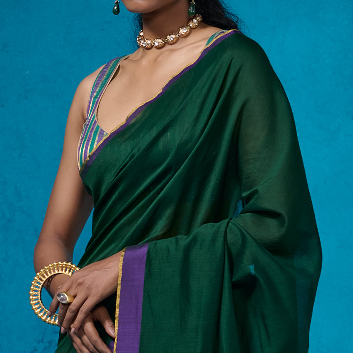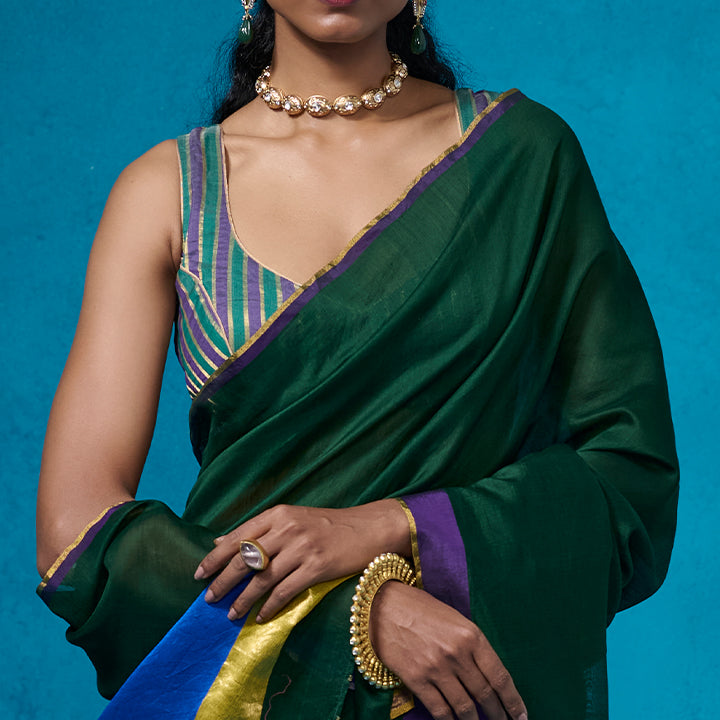 Introducing the elegant 'Tvisha' blouse - a sleeveless contemporary piece with a stylish dori tie-up at the back. This exquisite dark green and regal purple blouse is crafted from handloom Chanderi fabric.