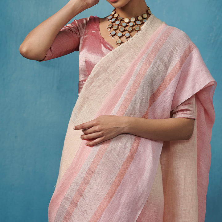 A minimalistic linen saree for those who want to keep it light and breezy. Its soft hues and breathable fabric exudes an understated luxury. Style it up with a statement piece and flats.