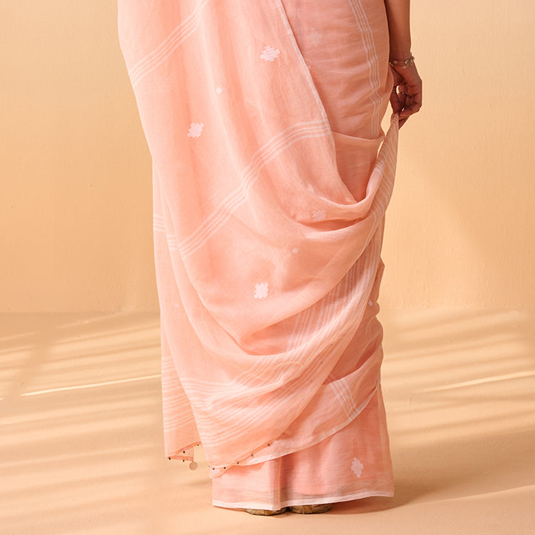 Experience the rhythm of life like never before. Meet Varari, our exquisite peach saree, evoking a sentiment of movement as if it were a gentle, amorous ragamala-inspired sway. The delicate buttas and stripes emulate this, along with intricate wooden beads as details.