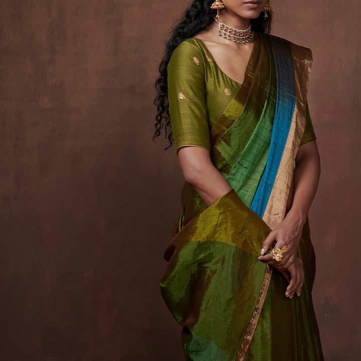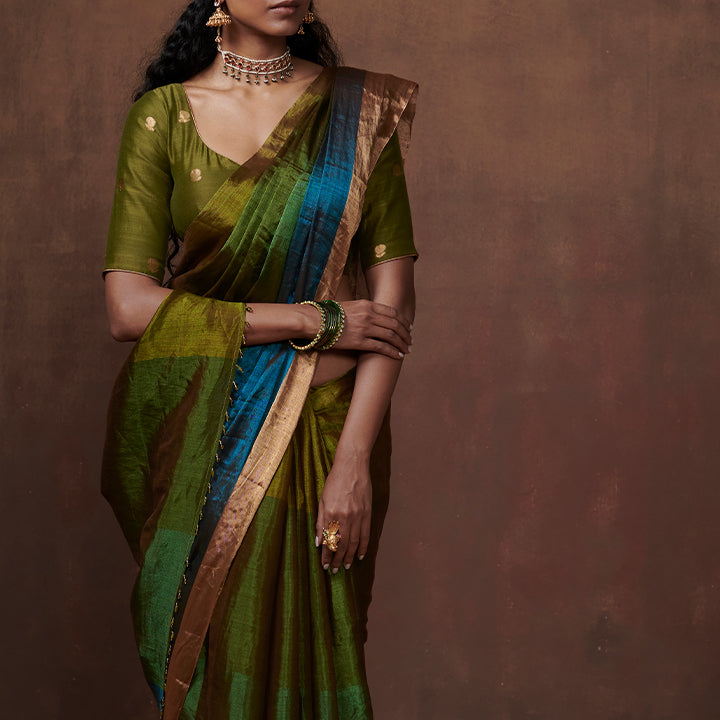 Step up your fashion game with the exquisite elegance of this handwoven Chanderi tissue saree. Seamlessly blending the grace of green hues with statement-making firozi zari, this saree is sure to accentuate your allure.