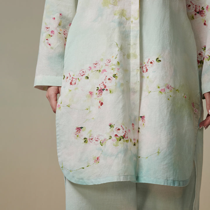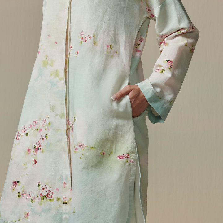 Experience the serene feeling in the "Whimsical Garden" set. This kurta's unique front open design and the convenient pockets in both pieces add a touch of practicality and style. Whether you are at work or enjoying an evening with friends, this outfit is a must-have for your wardrobe.