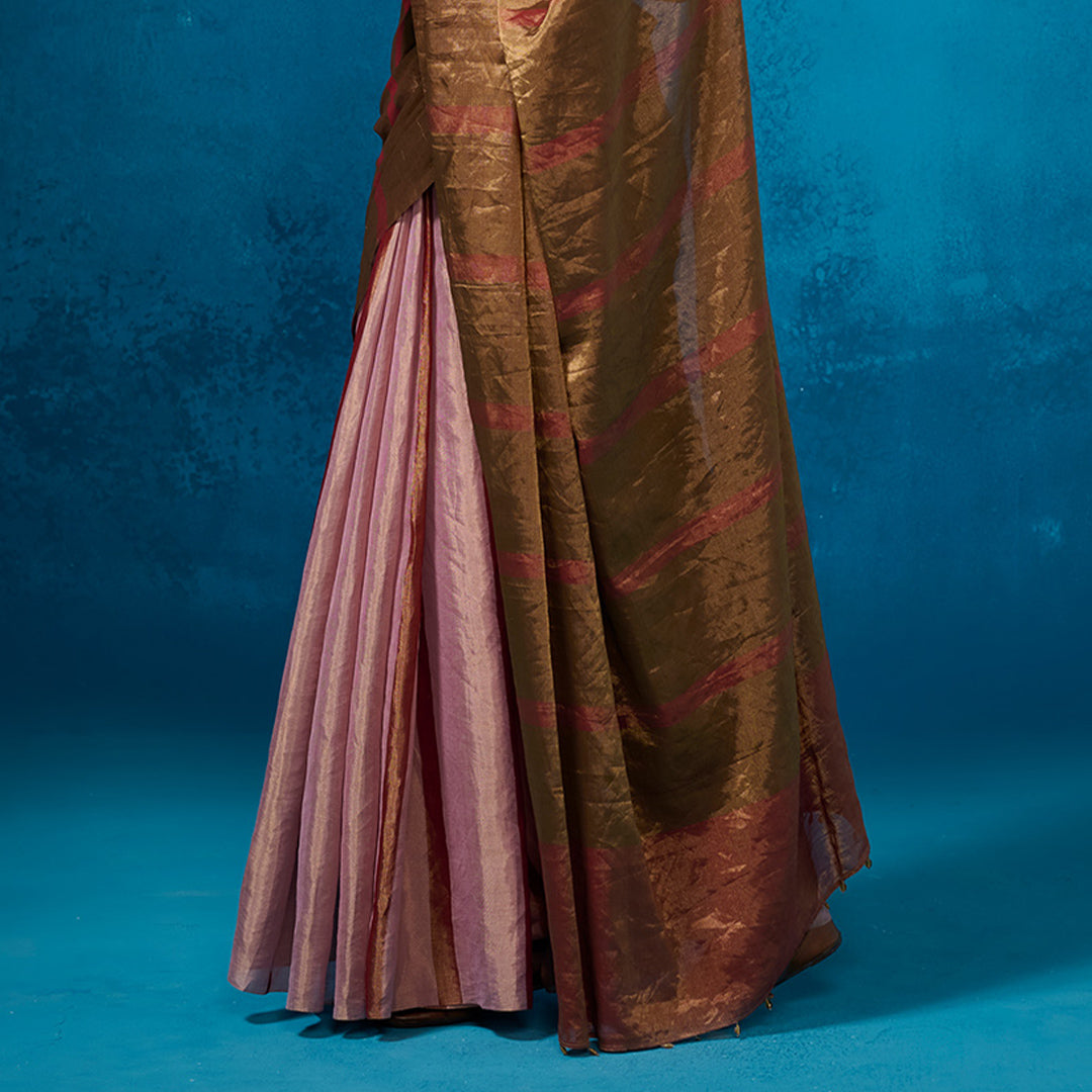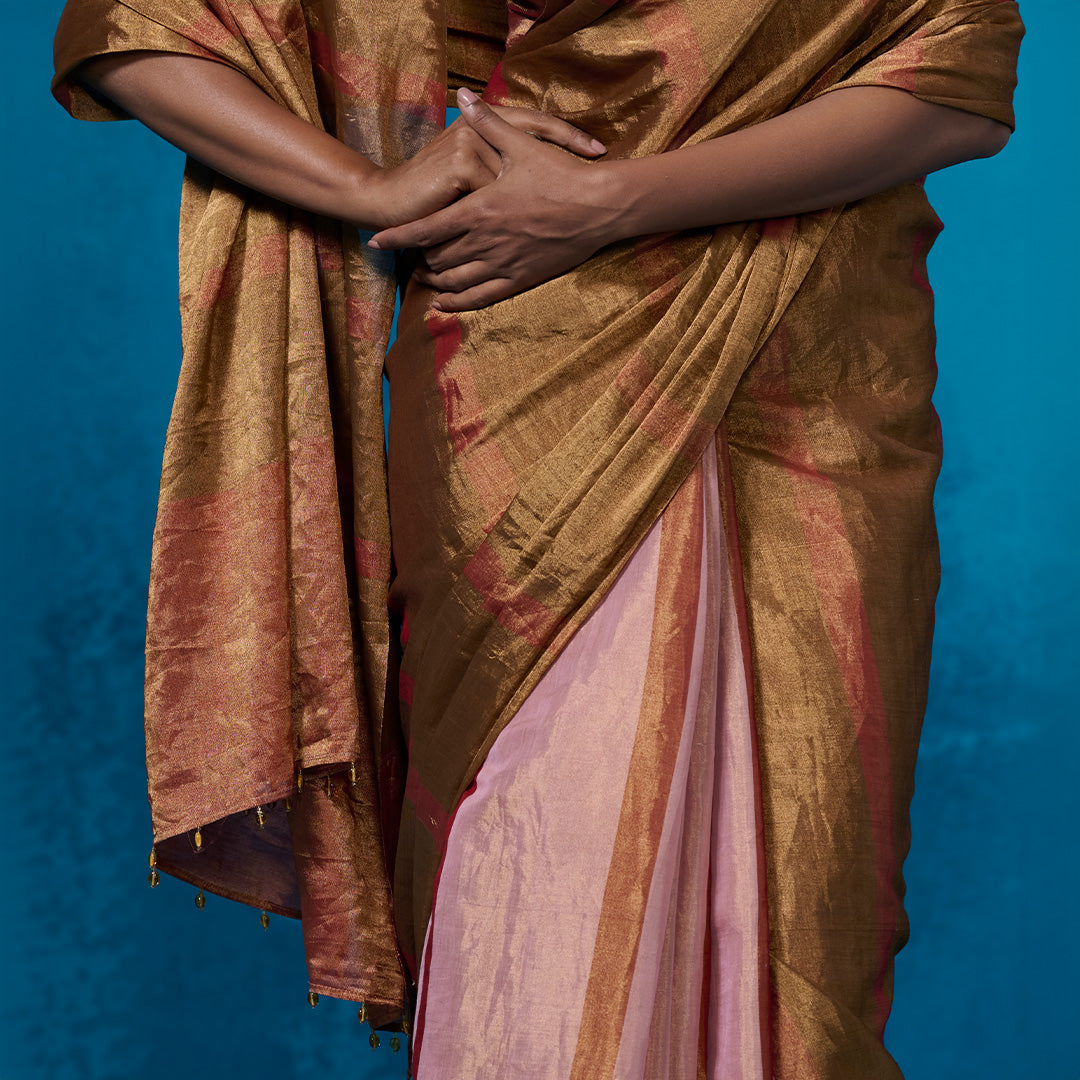Be the belle of the ball in 'Yamika', a tissue saree with gold zari base, lilac and rust stripes, and elegant detailing finished with Dressfolk coins and glass beads.