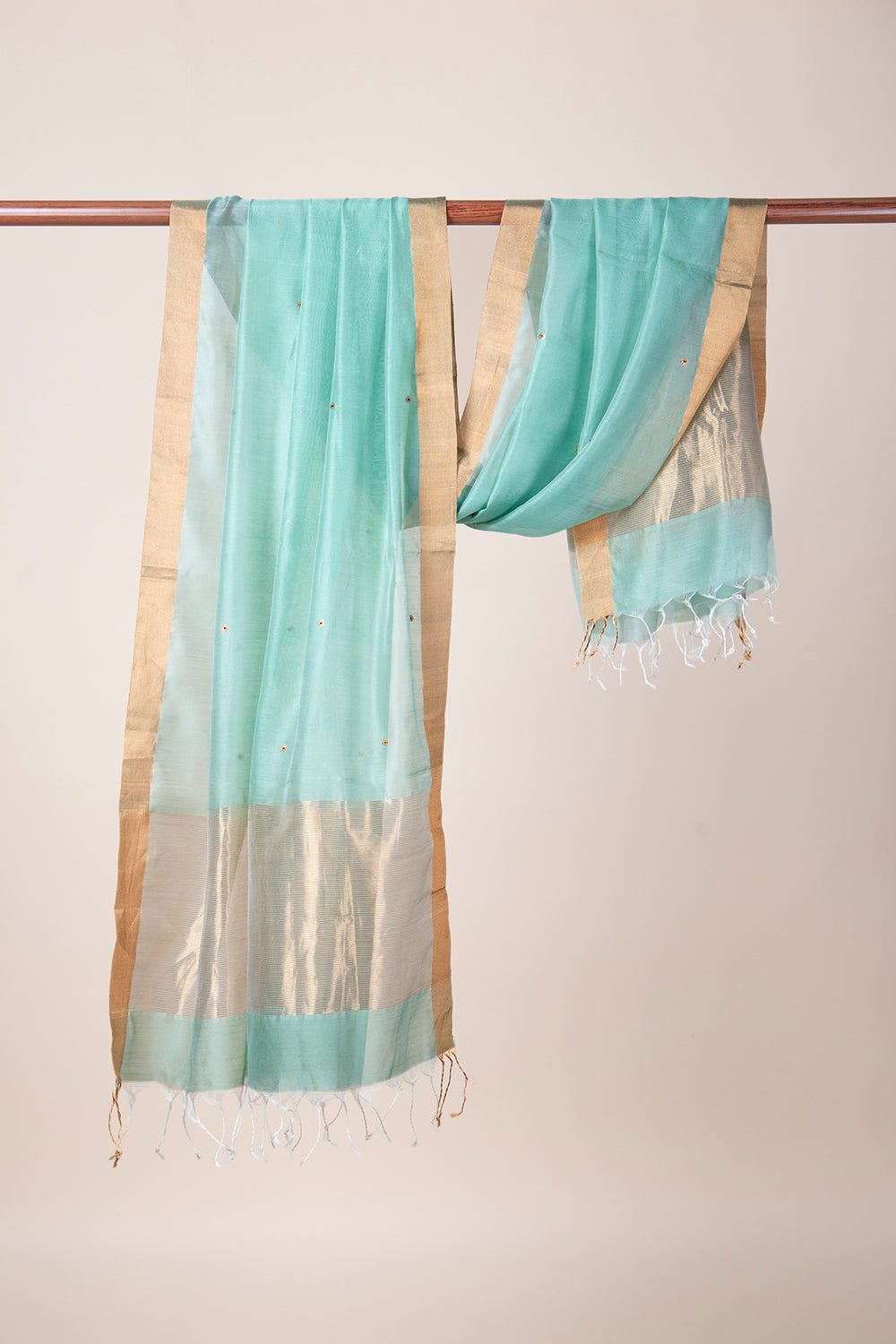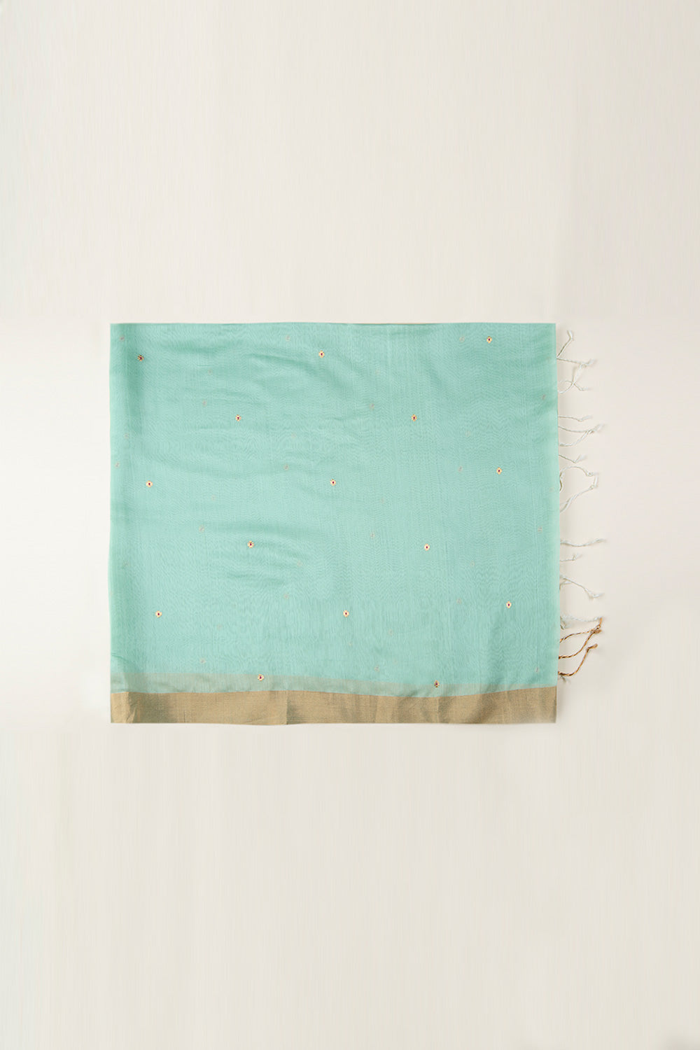 Handwoven in Chanderi, this turqiouse dupatta is adorned with delicate 'Chameli' floret motifs in traditional kadwaa technique. It is further accentuated with zari border and hand made tassels.