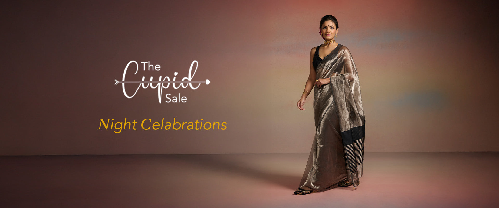 Lustrous pink-gold crinkle tissue saree