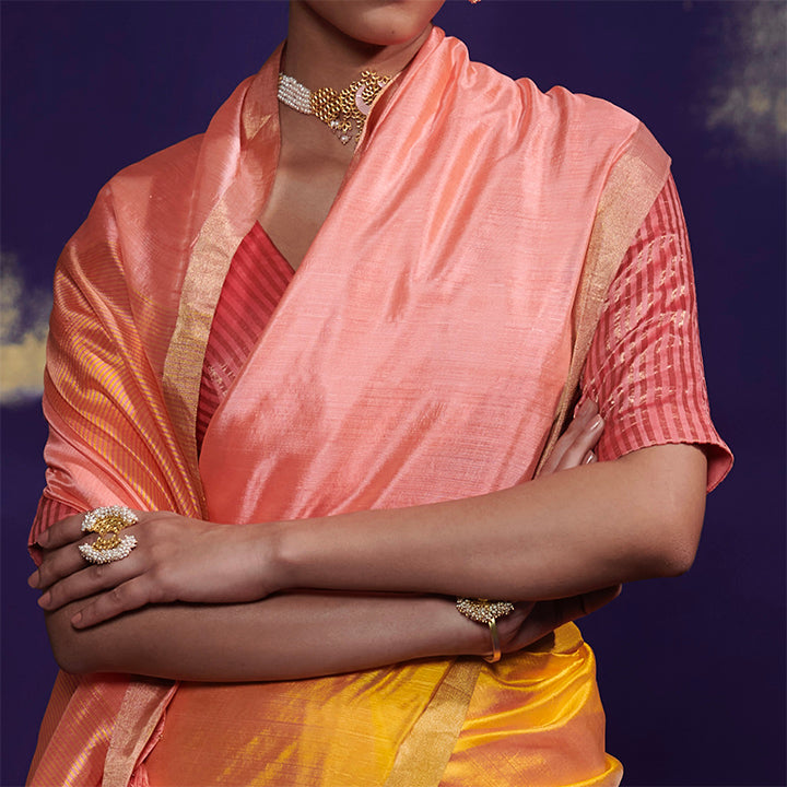 A modern reincarnation of the classic v-neck blouse. Handwoven in Silk cotton, this candy pink, and golden striped blouse adds a touch of luxury to your look.