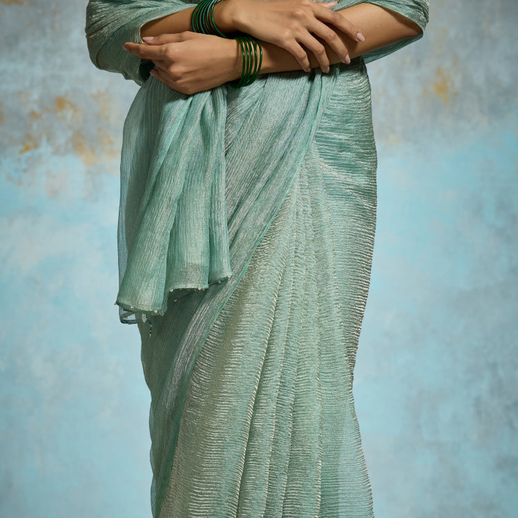 Handwoven on silver tissue in a refreshing aqua, is the lightweight 'Anvita'. It drapes beautifully, creating a soft, fluid silhouette, making it a charming choice for any occasion.