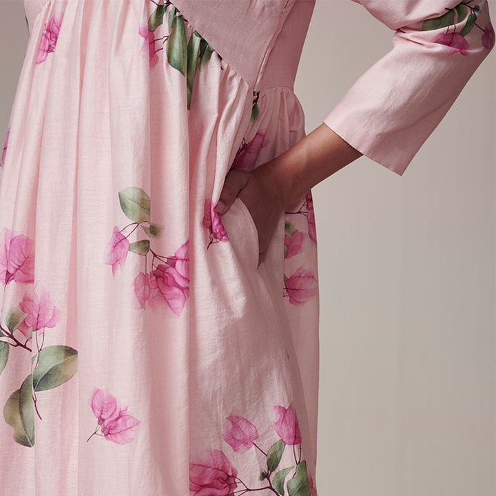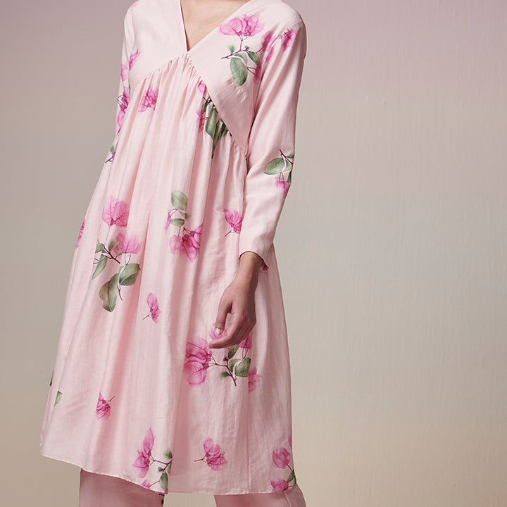 Step into the ethereal beauty of bougainvillea blossoms with "Bhumika" kurta and pant set. Handcrafted from the finest Chanderi, the pastel colour whispers spring mornings.