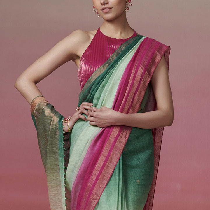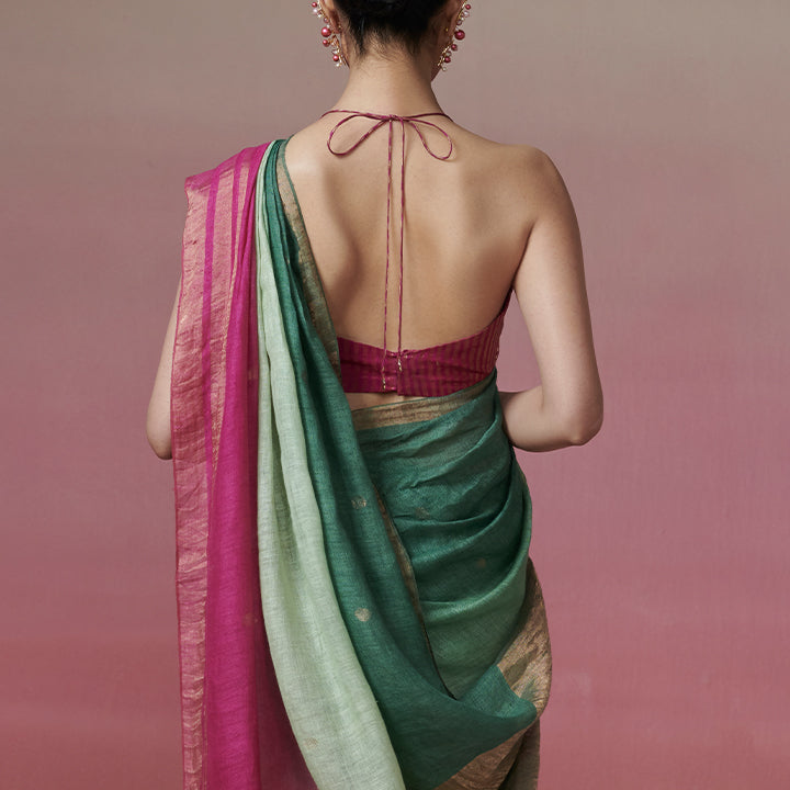 Embrace sophistication with this exquisite halter neck sleeveless blouse, crafted from handwoven silk cotton adorned with subtle zari stripes. It's alluring design is accentuated by stylish back detailing, perfect for those who appreciate refined elegance.