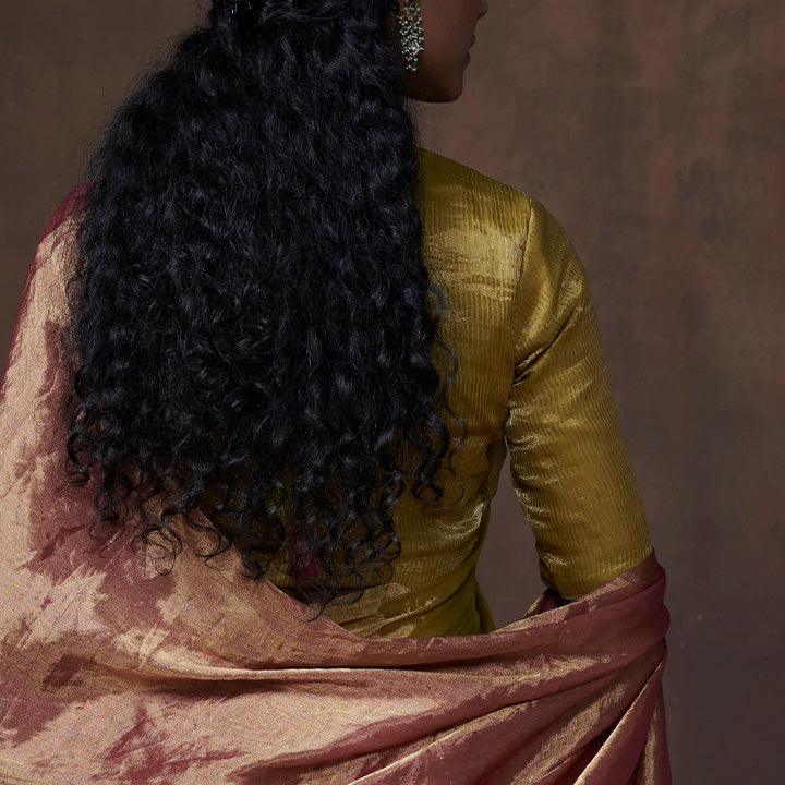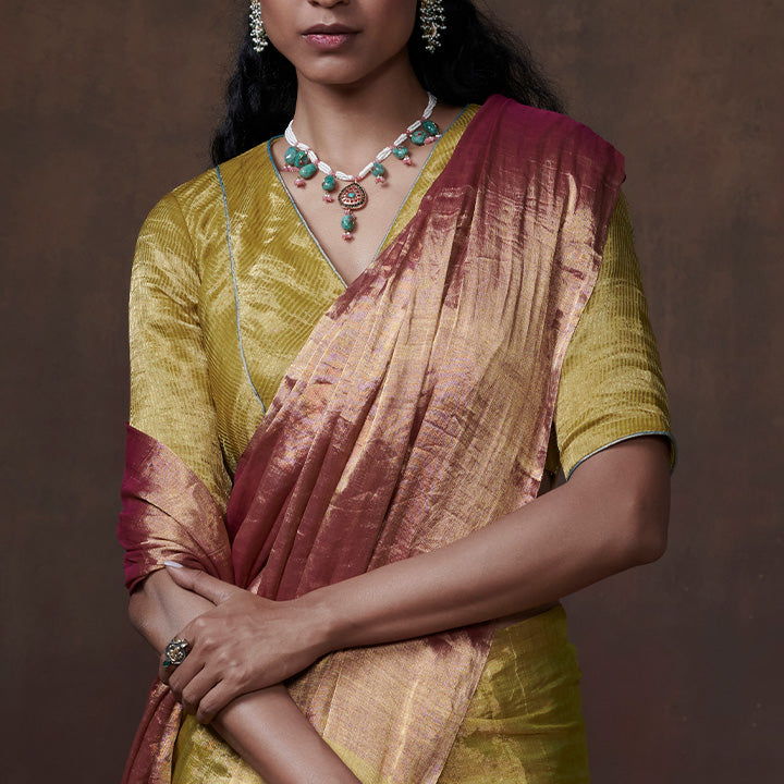 Lime yellow - silver zari striped chanderi tissue blouse