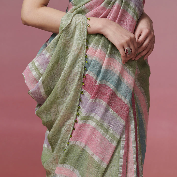 'Cherie Amour' masterpiece is reminiscent of a garden in full bloom. Silver zari threads weave through, creating a visual poetry that's perfect for garden parties, art exhibitions, and expressing your vibrant personality. Style it with dangle earrings for a complete look.