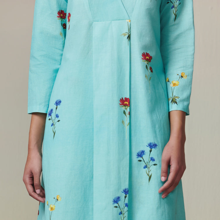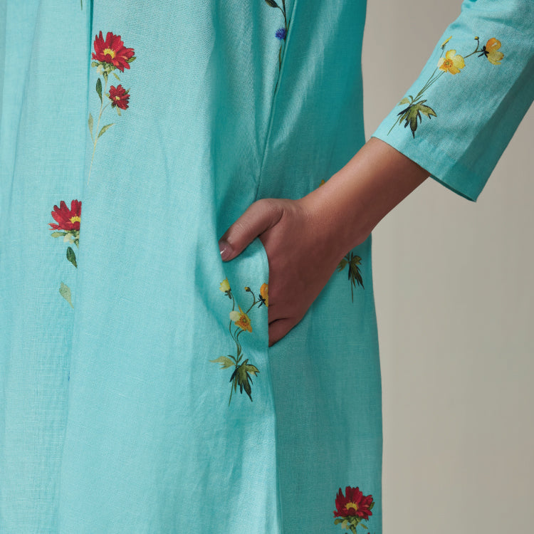 Step into a beautiful flowery paradise with this Linen-cotton kurta and pants. The delicate print brings a hint of everlasting grace.