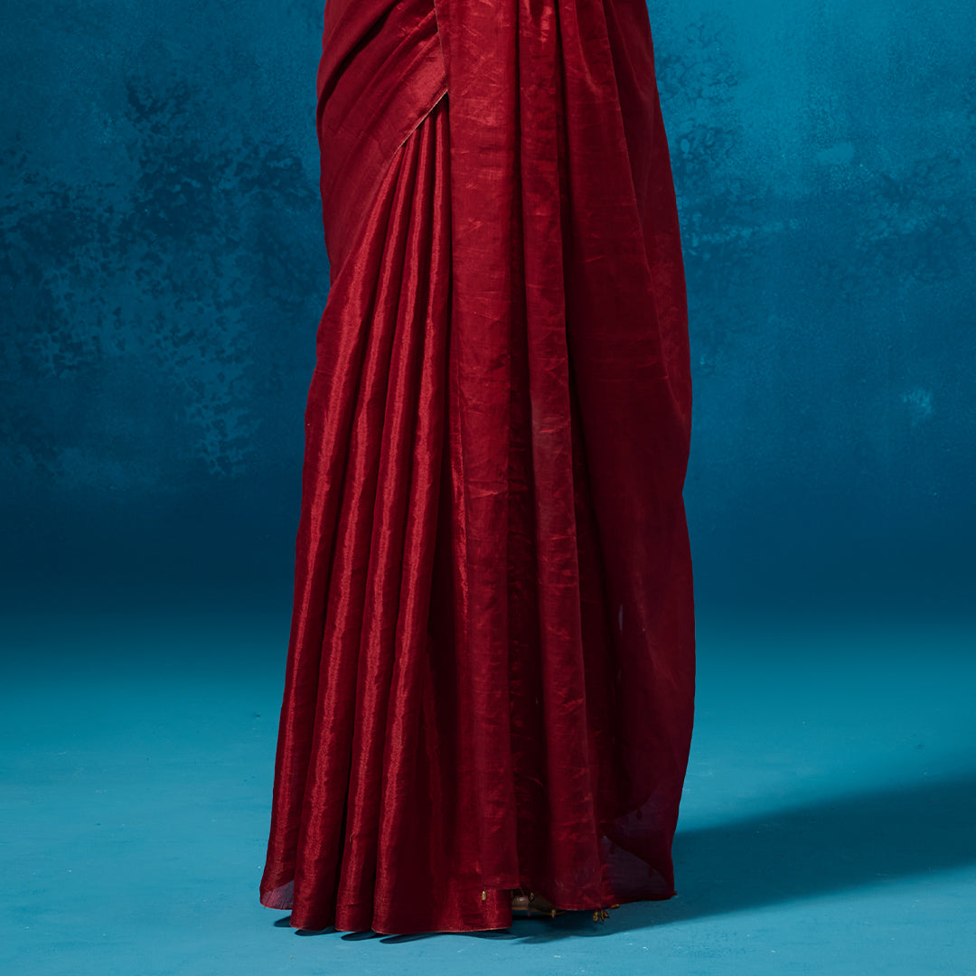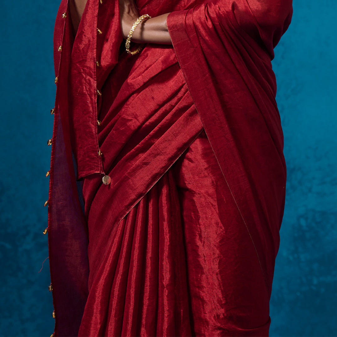 Embrace the radiance of a flame with 'Dilaab'. This exquisite tissue saree features a rich, deep red base and an elegantly adorned pallu with intricate Dressfolk coins and glass beads, adding a touch of luxury to your wardrobe.